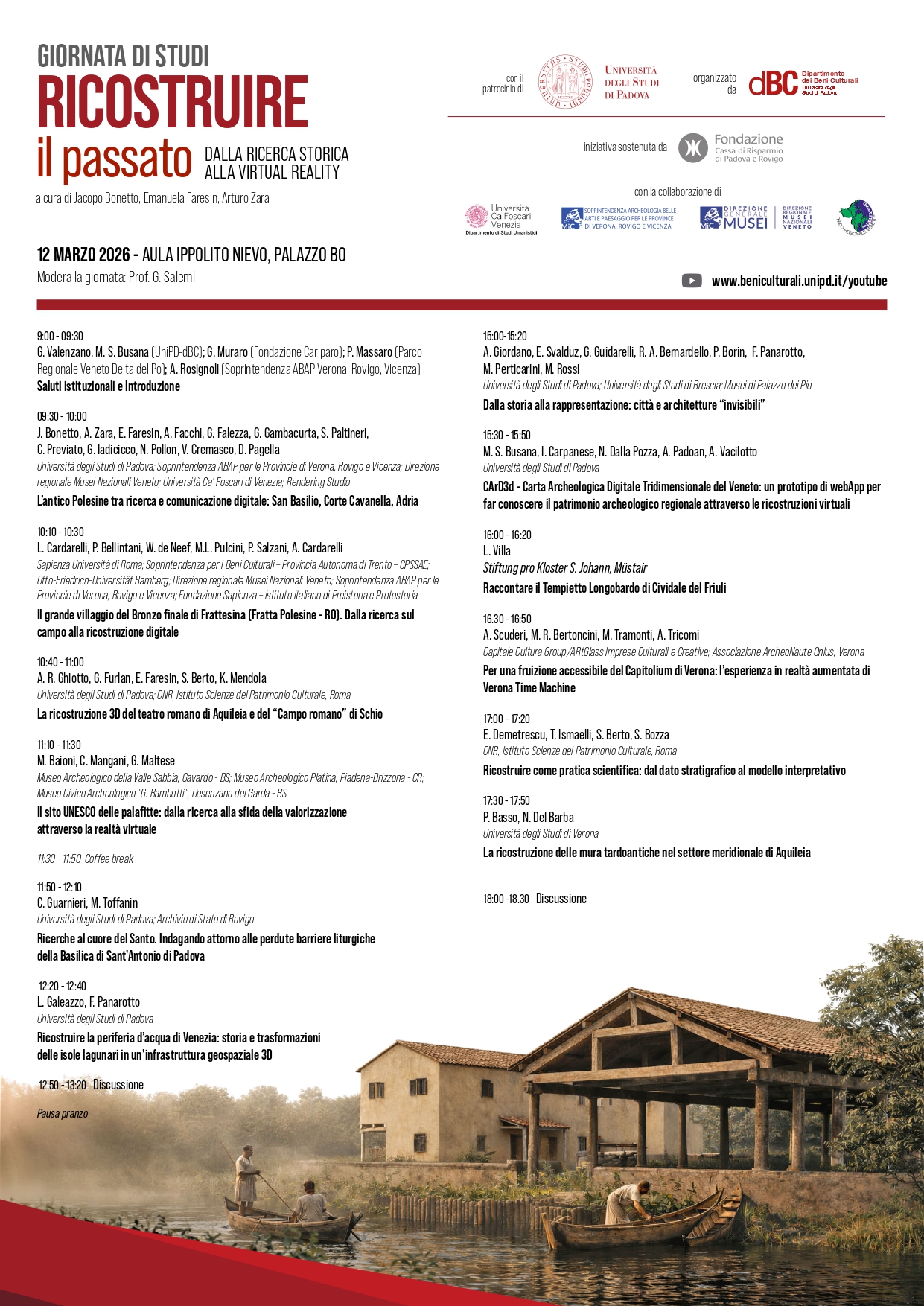 La giornata sarà aperta dalla prima presentazione pubblica delle ricostruzioni dei siti archeologici di Corte Cavanella, San Basilio e Frattesina in Polesine, cui hanno contribuito il Dipartimento dei Beni Culturali dell’Ateneo patavino e l’Università Ca’ Foscari di Venezia in un progetto sostenuto dalla Fondazione Cassa di Risparmio di Padova e Rovigo e dal Parco Delta del Po Veneto. Hanno coordinato le attività la Soprintendenza archeologia belle arti e paesaggio per le province di Verona, Rovigo e Vicenza e la Direzione Regionale Musei Nazionali del Veneto.
