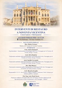 Mercoledì 4 febbraio 2026 alle ore 17.30 a Villa Barbarigo di Noventa Vicentina, la presentazione degli interventi di restauro a Noventa tra conservazione e valorizzazione. Interverranno, tra gli altri, il Soprintendente Arch. Andrea Rosignoli e i funzionari della Soprintendenza ABAP di Verona, arch. Silvia Dandria, Arch. Isabella Cavazzutti e la Restauratrice Rita Bonazzi.